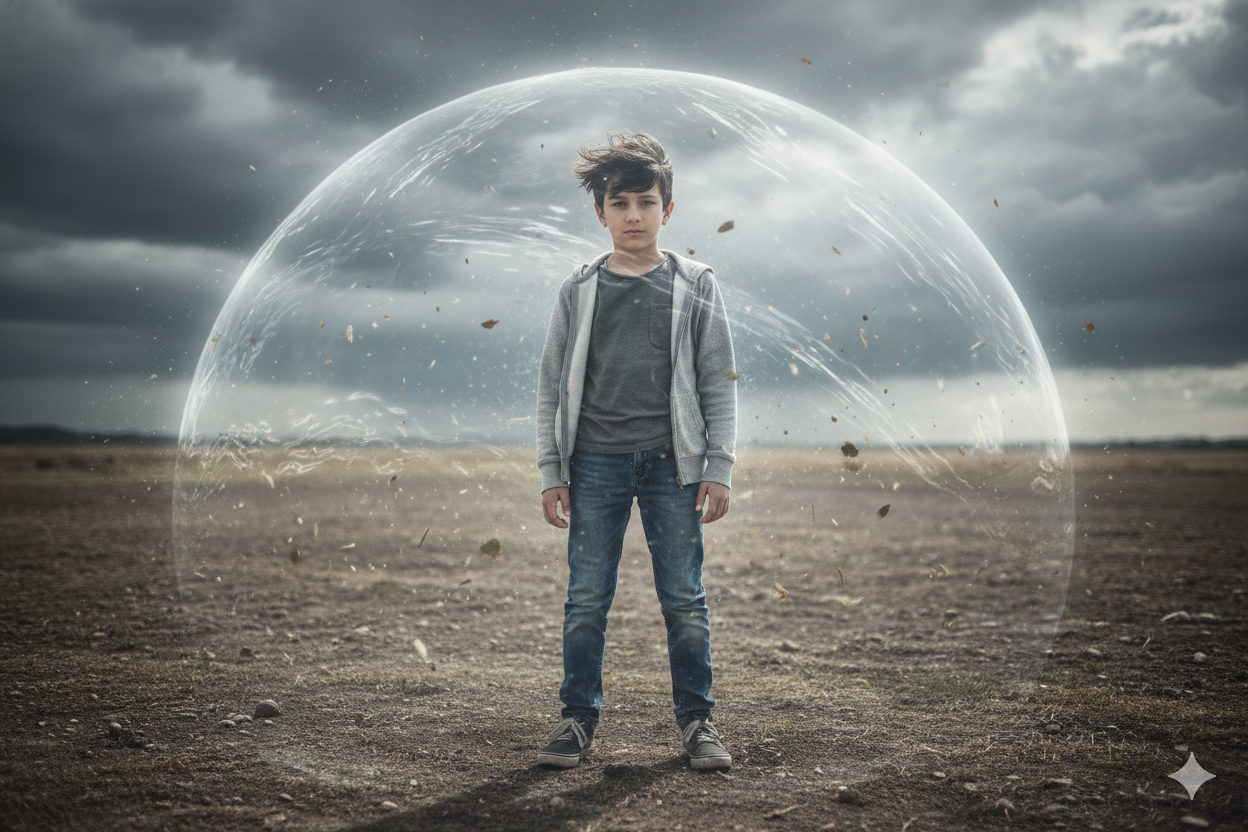 Boy Standing in Wind While a Powerful Invisible Force-Field Protects Him