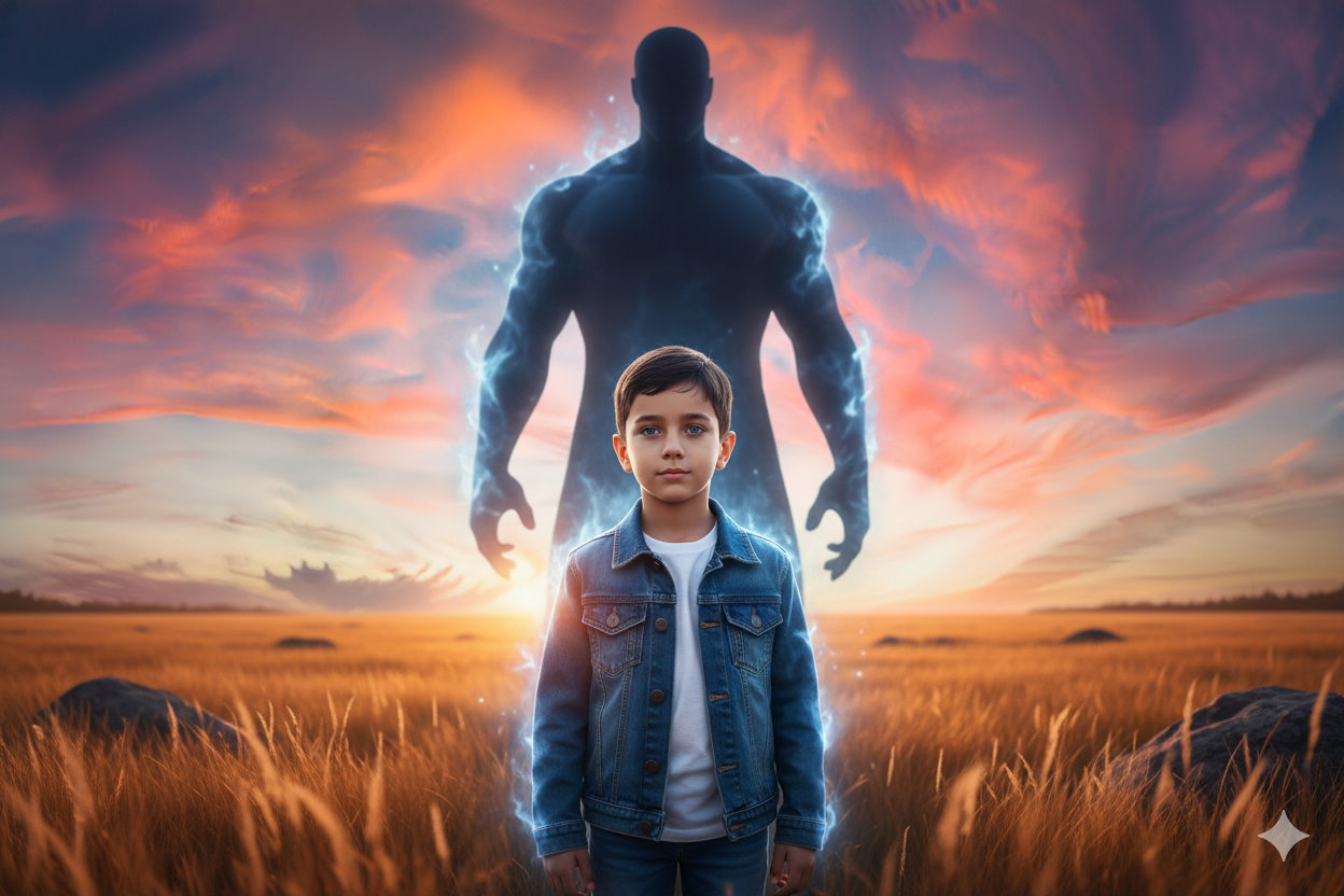 Boy Standing on Open Field at Sunset While a Huge Shadow and Glowing Smoke Guardian Forms Behind Him