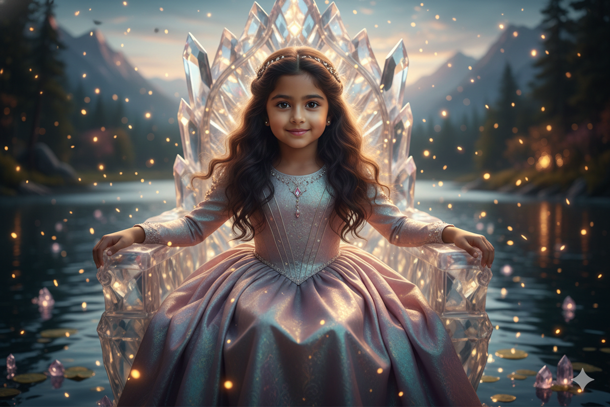 Girl Sitting on a Floating Crystal Throne Surrounded by Fireflies