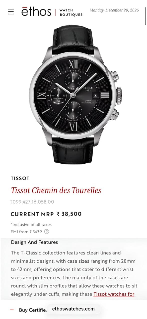 Paired with an exclusive black leather strap detailed with Tissot branding and an easy-operated lock, this watch ensures both comfort and refined appeal. Suitable for office wear, formal occasions, and everyday elegance.
